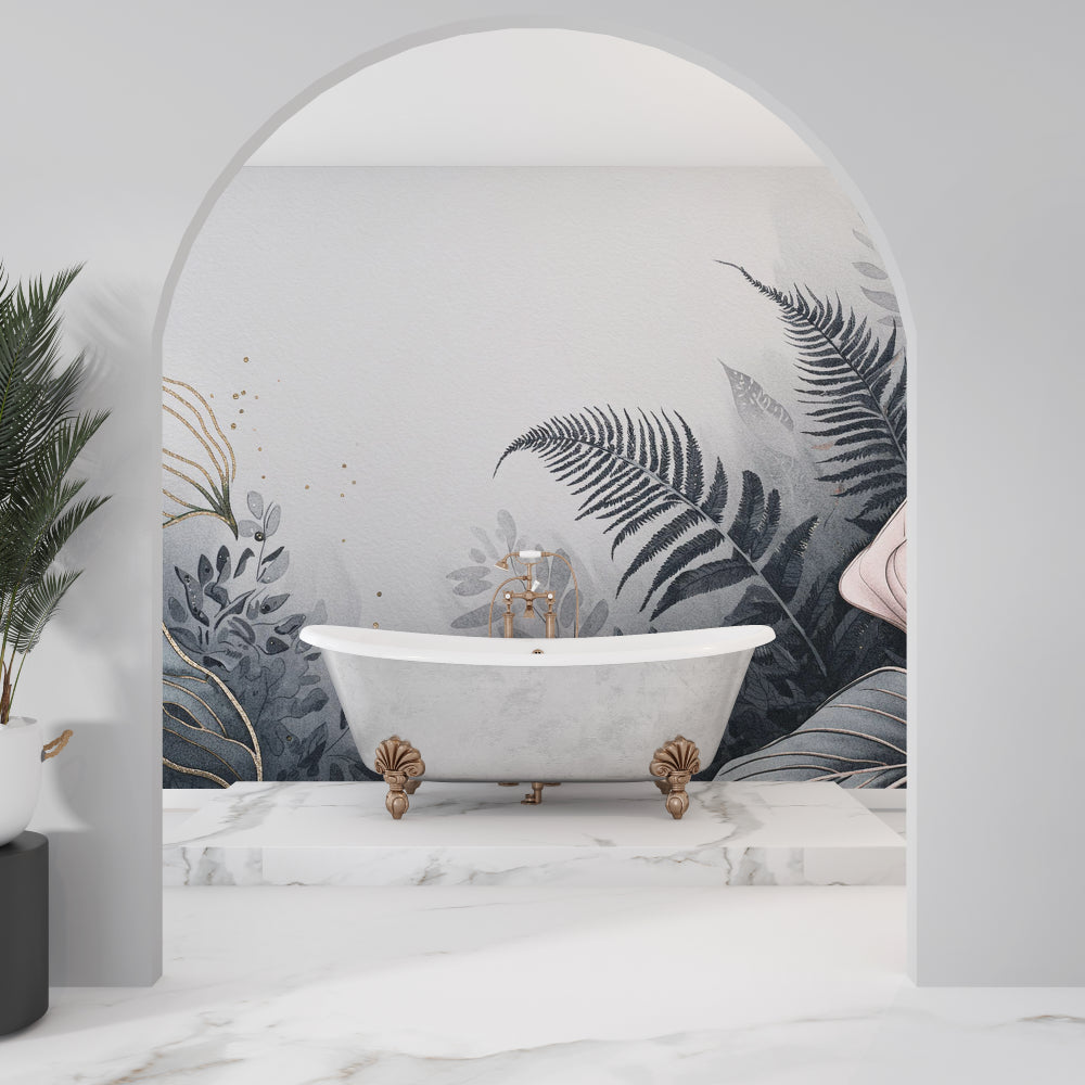 Denna tropiska ormbunke tapet presenterar en elegant komposition av kolgrå palmblad och ormbunkar mot en dimmig vit bakgrund. Fina gulddetaljer och subtila botaniska silhuetter skapar lager av djup, medan den botaniska väggmålningen behåller en sofistikerad monokrom palett förstärkt av metalliska inslag som fångar ljuset med diskret glamour.