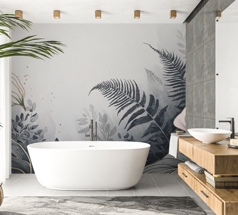 Förvandla ditt utrymme till ett lugnt fristad med denna moderna botaniska tapet. Den lyxiga lövmålningen ger en känsla av spa-liknande lugn samtidigt som den behåller en samtida kant, vilket gör den särskilt lämplig för badrum och wellnessutrymmen där naturinspirerad sofistikering möter modern designkänsla. Den balanserade kompositionen skapar en lugnande men slående fokuspunkt som höjer varje interiör.