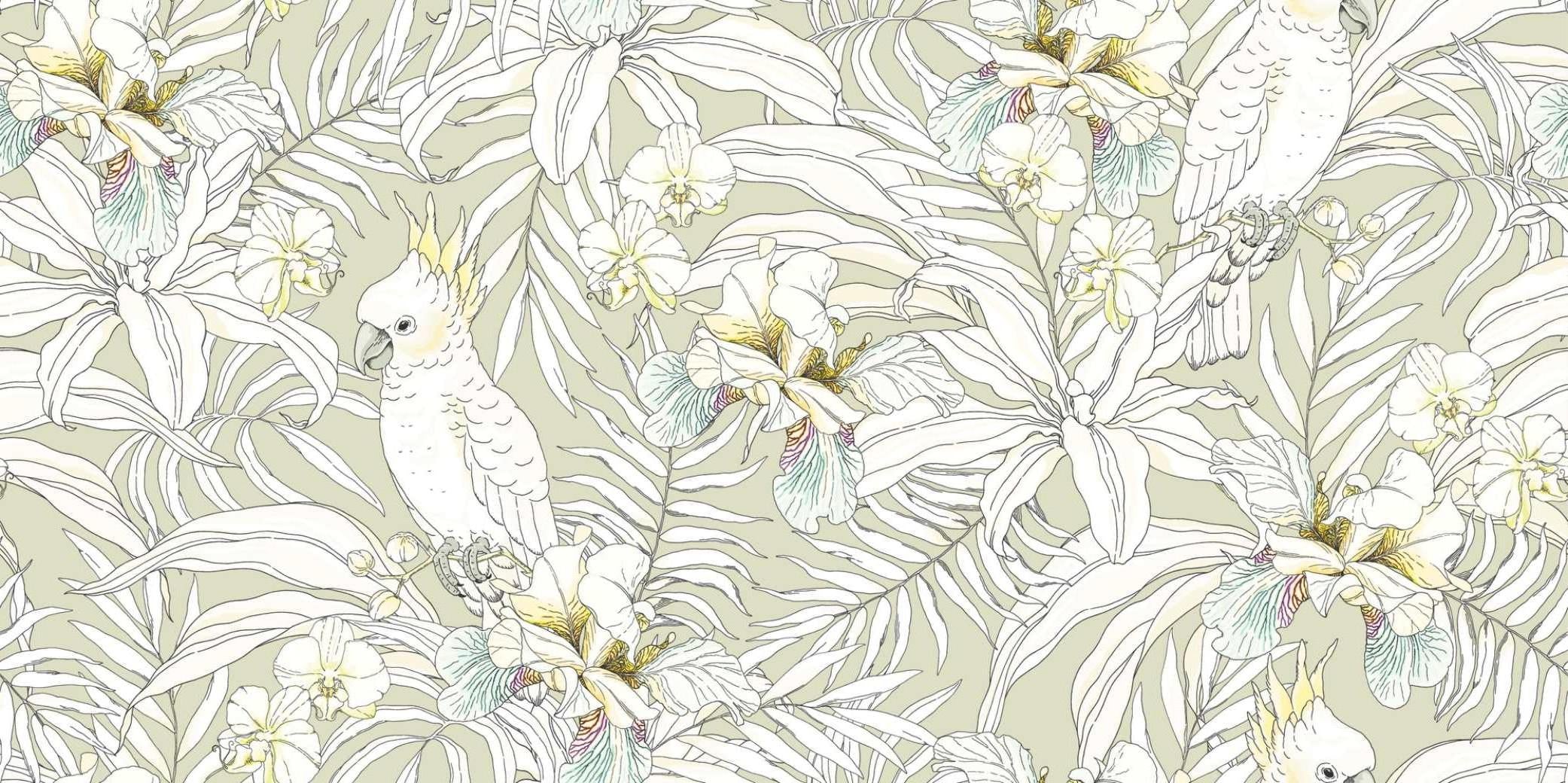 Denna tropiska fågel tapet visar en elegant komposition av vita kakaduor bland ömtåliga orkidéblommor och palmblad. Mot en mjuk salviagrön bakgrund skapar linjekonstillustrationsstilen en sofistikerad botanisk berättelse. Den exotiska fågelmuralen har fläckfritt vita papegojor med noggrant detaljerade fjädrar, kompletterade av graciösa orkidéer i subtila nyanser av gult och blekt turkos, allt sammanvävt med flödande tropiskt lövverk.